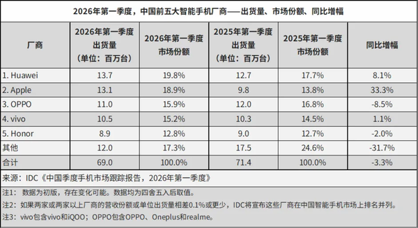 厂商表现方面,三星在2026年第一季度重回榜首,出货量同比增长3.6%,主要得益于新款Galaxy S26 Ultra的强劲需求。苹果位居第二,iPhone 17系列表现强劲,尤其在中国市场实现了超过30%的增长,带动第一季度全球销量同比增长3.3%。小米、OPPO和vivo分别位列第三、第四和第五。